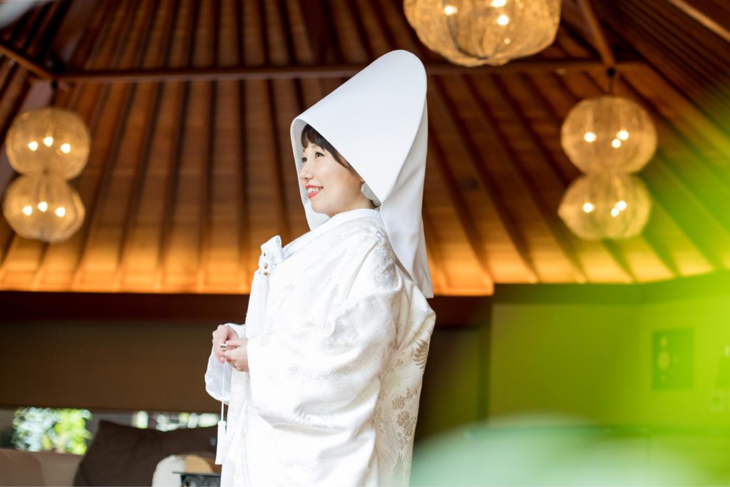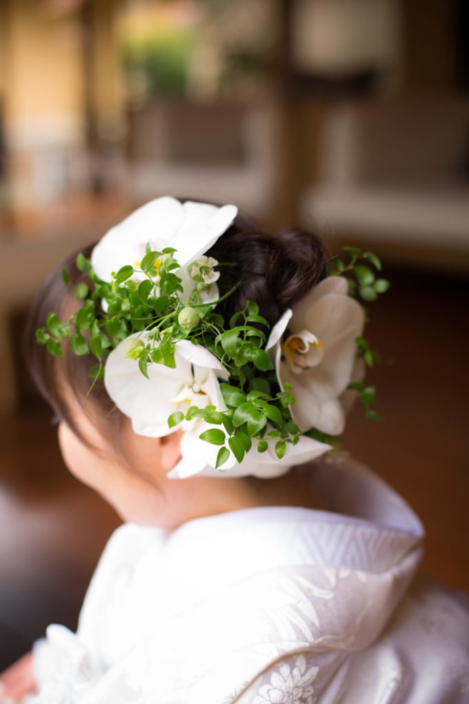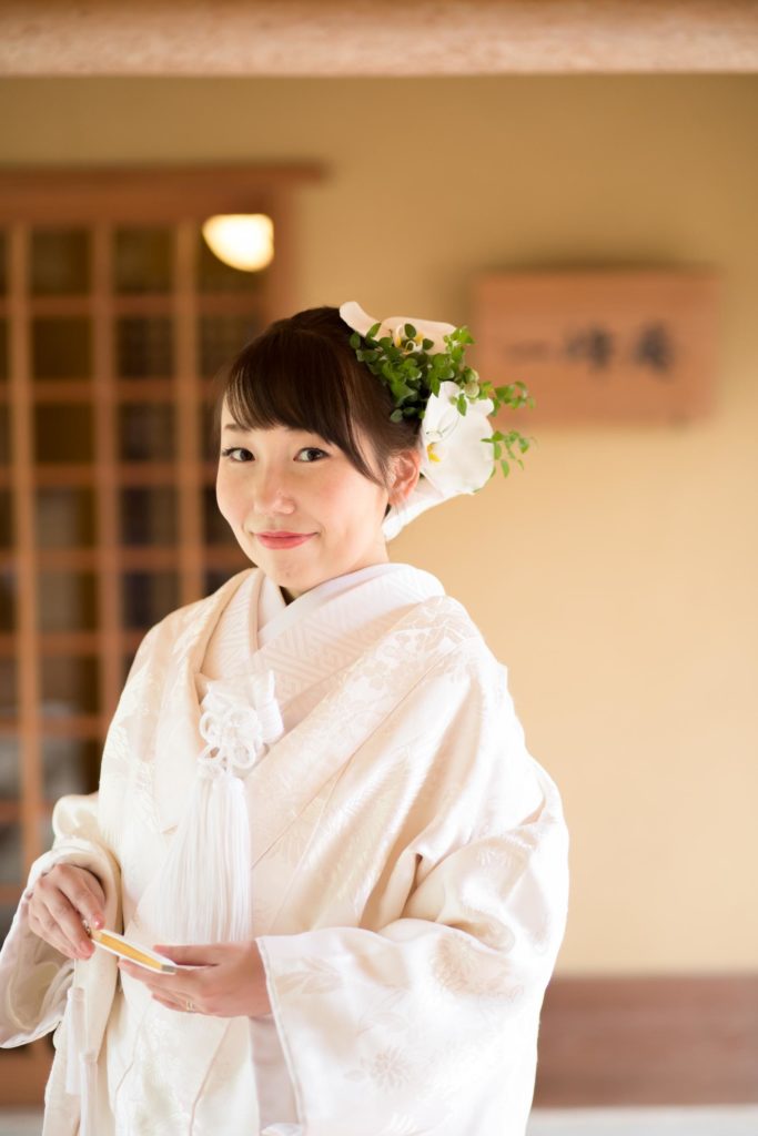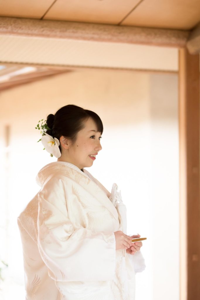 白無垢姿は綿帽子と、ヘッド装花は生花の真っ白な胡蝶蘭で