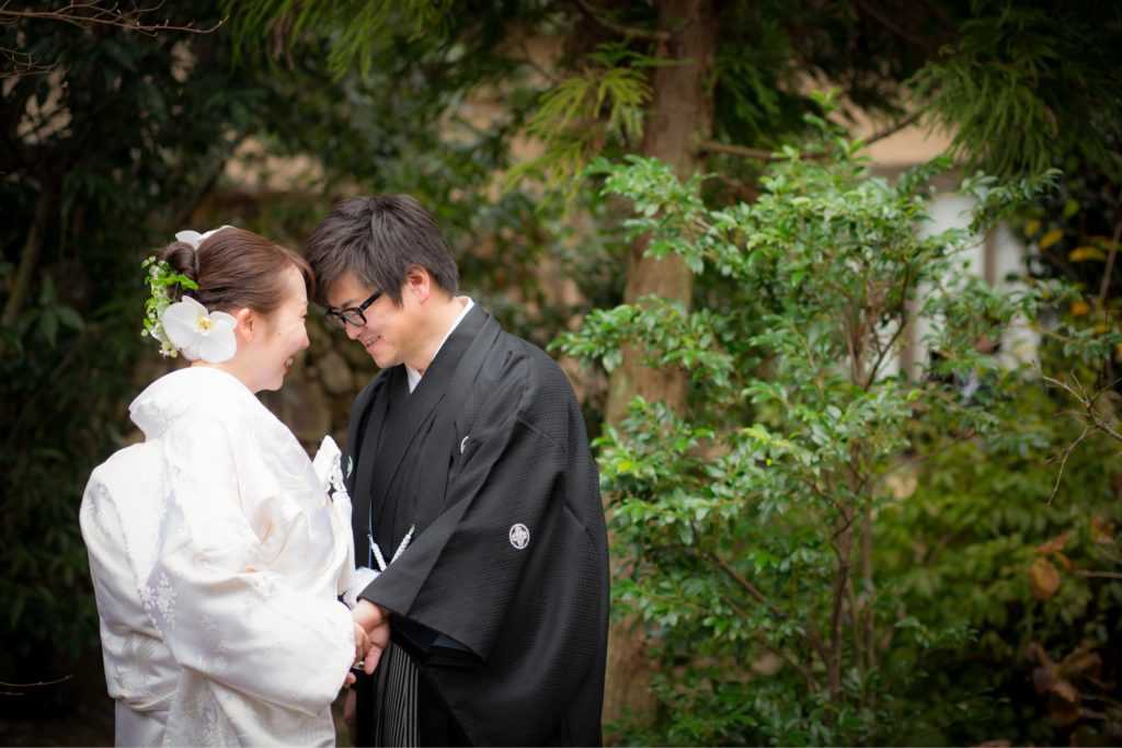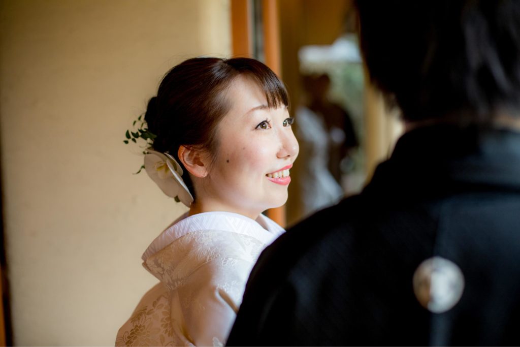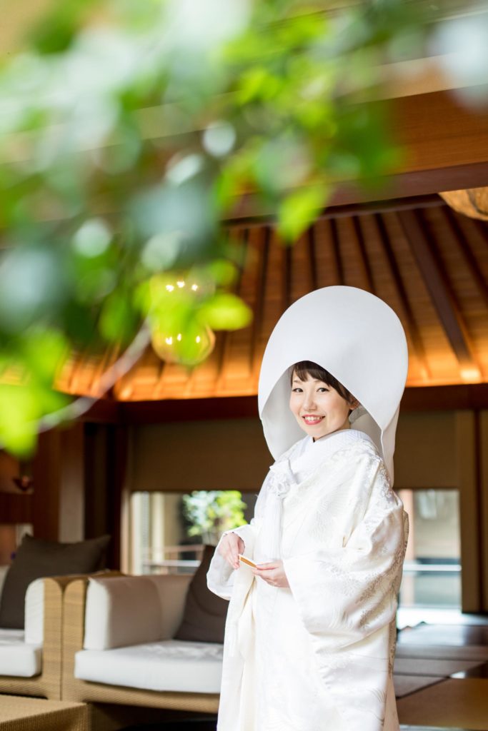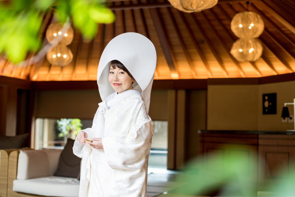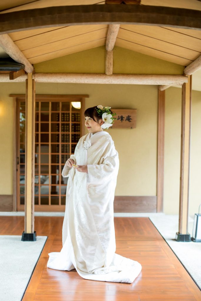 白無垢姿は綿帽子と、ヘッド装花は生花の真っ白な胡蝶蘭で